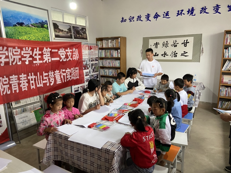 实践活动开始前,队员们号召全院学生开展了“好伙伴共成长”募捐活动,收到了同学们向甘山村的孩子们捐赠的图书和玩偶。实践期间,队员们组织了一系列趣味游戏与孩子们互动,开展了“未来的甘山”绘画比赛。孩子们纷纷拿起画笔,一笔一划地描绘着心目中美好的家乡,比赛结束后实践团也为孩子们送上了书包、台灯、钢笔等奖品。此外,学生第二党支部的党员也为孩子们精心准备了一节党课,向孩子们介绍了国旗、党旗和团旗等小知识。