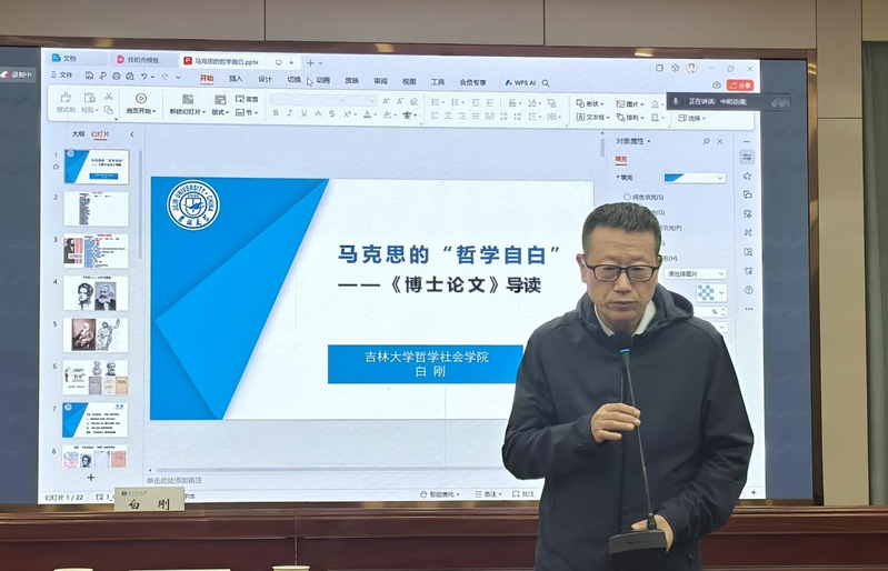 10月31日,“中和论道”第113期在tyc8722太阳集团城4楼报告厅举行。本次讲座的主题为“马克思的‘哲学自白’——《博士论文》导读”,由吉林大学哲学社会学院院长白刚教授主讲,学院党委书记姜宗强教授主持,马克思主义学院马乔恩教授、学院王珅副教授参与与谈。讲座吸引了校内外诸多师生线上、线下热情参与。