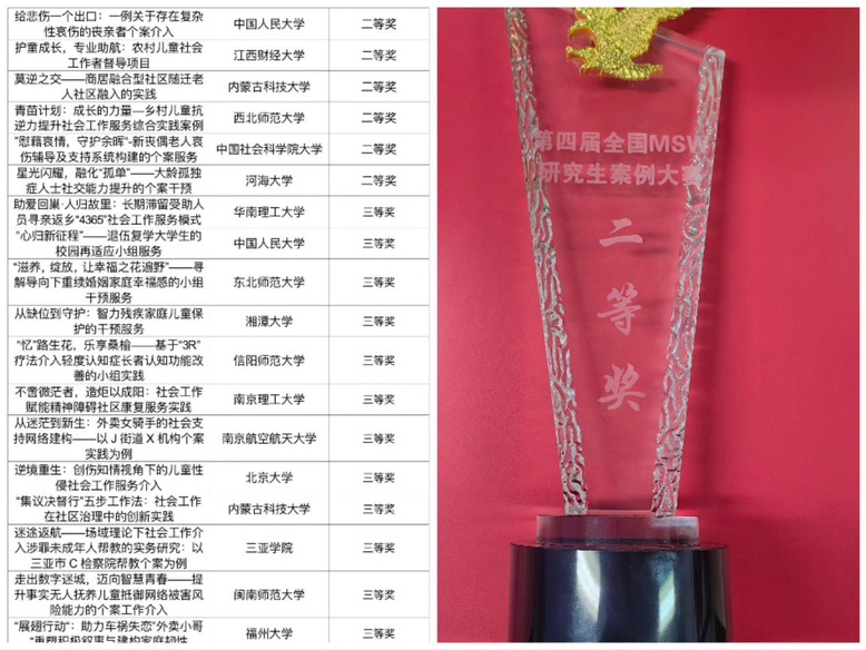 第四届“全国MSW研究生案例大赛”由全国社会工作专业学位研究生教育指导委员会指导,社会工作专业学位研究生教育院校联席会议主办,南昌大学公共政策与管理学院、社会工作(MSW)教育中心承办,是国内社会工作教育界高水平的学生实践交流平台,对于培养社会工作学生的学术素养、实务能力、专业思维具有重要作用。此次参赛,为我院师生提供了一个宝贵的与其他MSW培养单位深度交流学习的机会。