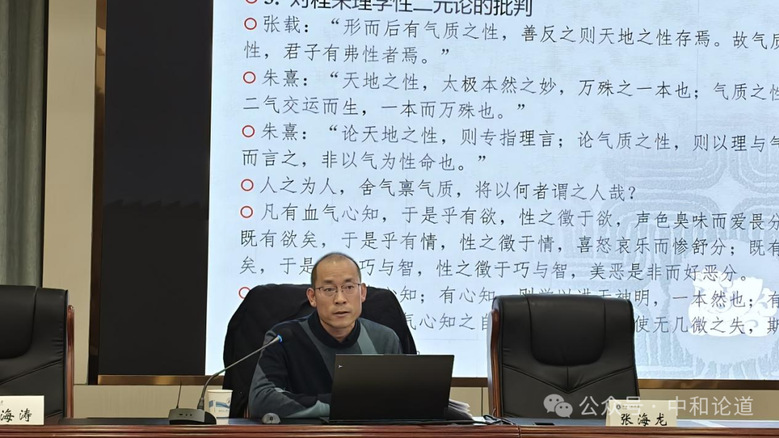 2024年12月19日,“中和论道”第118期在tyc8722太阳集团城4楼报告厅举行,本期讲座主题为“戴震的道德哲学及其现实意义”,由tyc8722太阳集团城任万明副教授主讲,tyc8722太阳集团城杜海涛副教授主持,张海龙副教授担任与谈人。讲座吸引了校内外诸多师生热情参与。