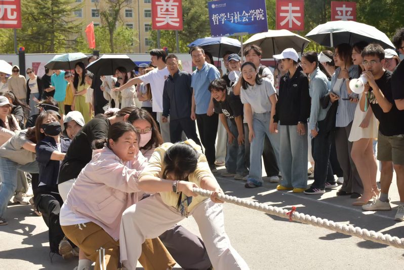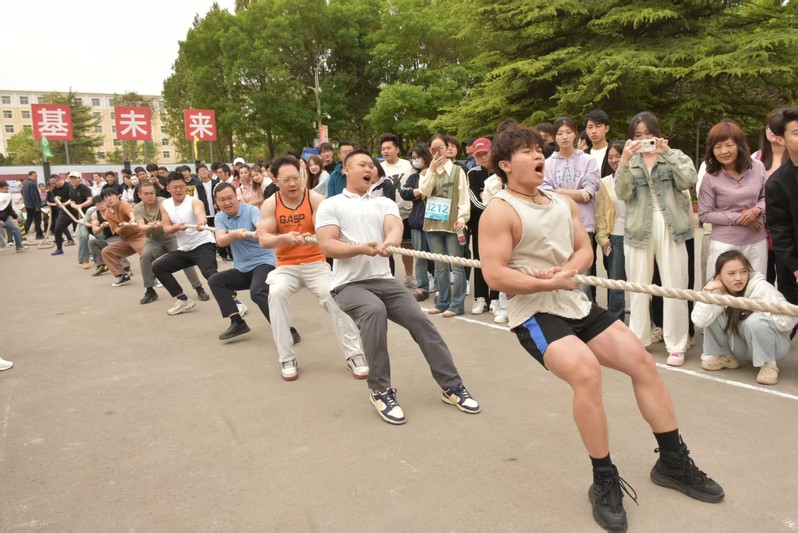 随着哨声响起,师生拔河赛火热开赛。红绳两端,老师们扎稳马步指挥节奏,学生们咬牙攥紧绳索,学院老师们及团学组织工作人员一同为运动员们激情助威,“哲社院,加油!”的口号此起彼伏。场边加油声震天,当学院队伍拼尽全力拽过决胜线时,师生们激动相拥,汗水与欢呼交织,尽显哲社学院团结拼搏的风采。