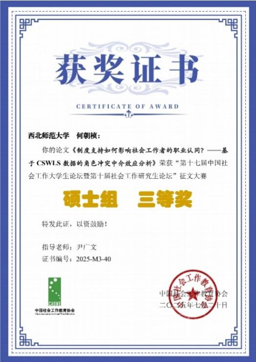 由我院尹广文教授指导的社会工作硕士研究生何朝桢同学撰写的《制度支持如何影响社会工作者的职业认同——基于CSWLS数据的角色冲突中介效应分析》获得参会发言资格,并荣获硕士组全国三等奖。