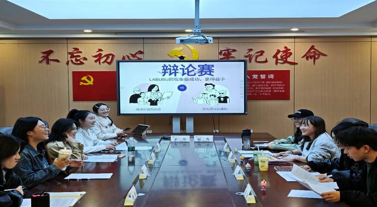 本次辩论赛围绕“LABUBU的现象级成功,更得益于情绪价值的创造还是文化符号的建构”展开对决,正方辩手白亭亭、郑雯心、杨景蓉、许楠楠与反方辩手刘芸、丁晓艳、陈怡如、王华禹等8位同学同台竞技。比赛通过立论、攻辩、自由辩论、总结陈词四个环节,展现了双方辩手扎实的学术素养、敏捷的应变能力和出色的语言表达能力,同学们思路清晰、攻防有序,进行了一场思想与语言的巅峰对决。